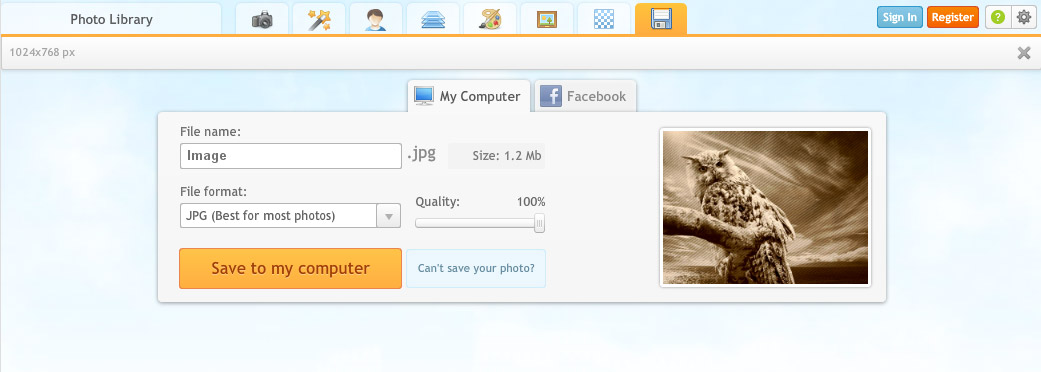iPiccy provides a Save module that allows you to save photos as JPG or PNG, as well as determine the photo quality and control the file size.