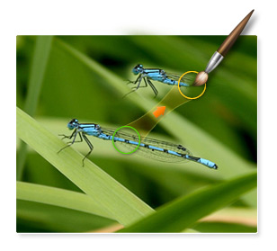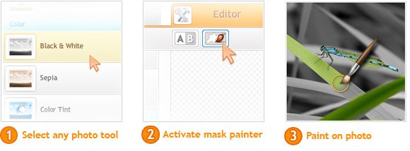 Almost every adjustment, filter or photo effect can be applied to specific areas or photos with mask painting. Effect mask defines where effect will be applied and effect intensity (by changing strength of the brush).